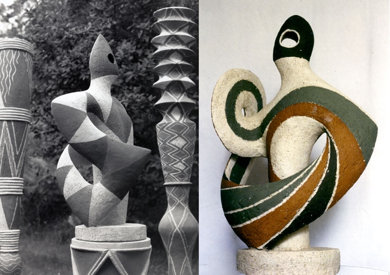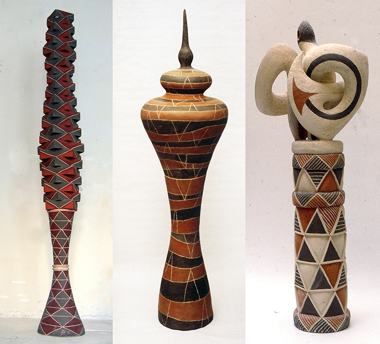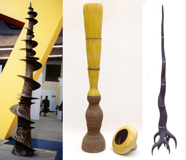 1990 Vrille Noire I, grès ht 260cm- 1988 Colonne des danseurs et spirale intérieure, faïence ht 230cm- 1990 Le germe, grès ht 230cm