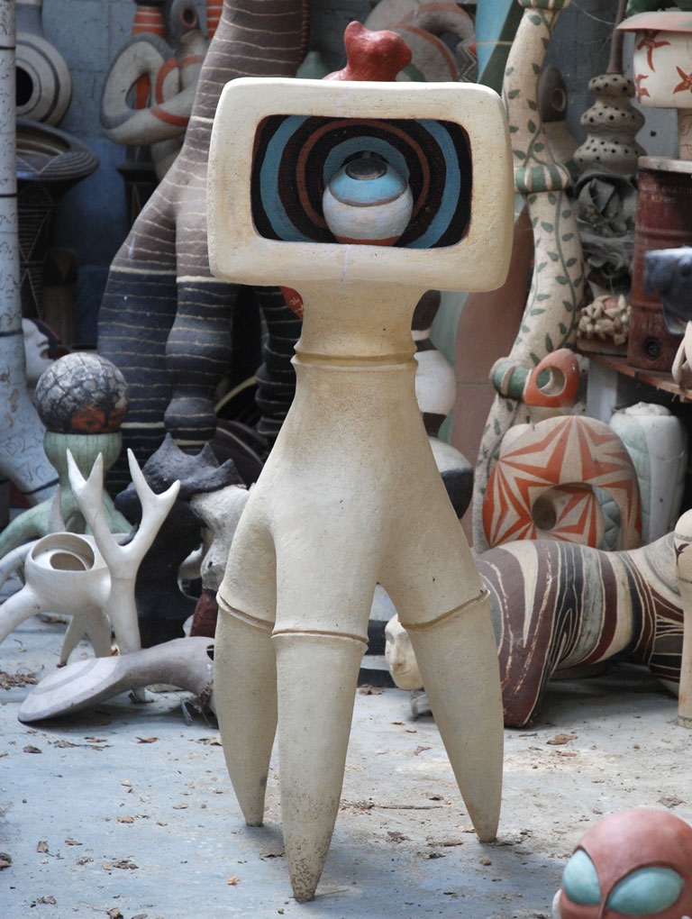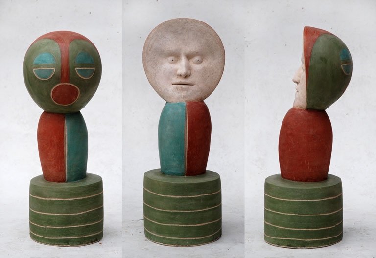 1990 Colonne quinconce grès ht 250cm. 1989 Puits d'Orient faïence ht 120cm. 1988 Guerrier de coeur faïence ht 160cm