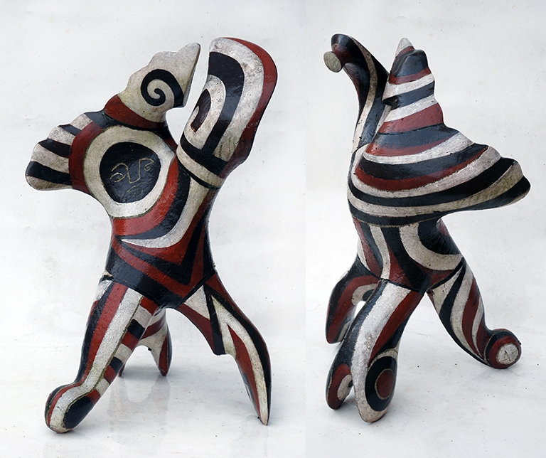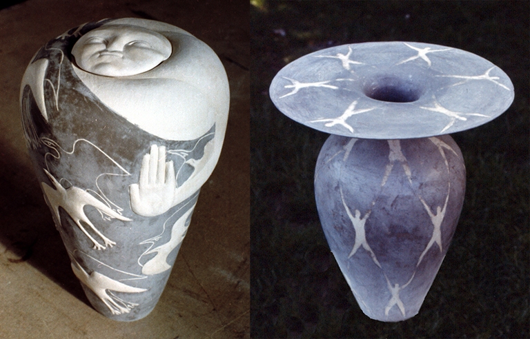 1990 Colonne quinconce grès ht 250cm. 1989 Puits d'Orient faïence ht 120cm. 1988 Guerrier de coeur faïence ht 160cm